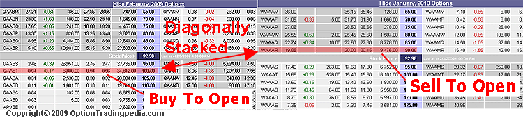 As you can see from the picture above, diagonal Short Calendar Spreads or Short Diagonal Calendar Spreads are so named in options trading due to the way the options involved are lined up diagonally across an options chain.