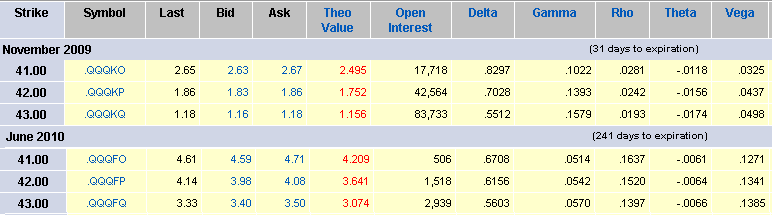 The picture above shows the June 2010 and November 2009 call options on the QQQQ across 3 strike prices. As you can see from the picture above, theta values of the November 2009 call options are more than twice the theta value of the June 2010 options. However, the June 2010 options have a lot more extrinsic value than the November 2009 options. This is why Short Calendar Spreads cannot depend on time decay for profit through difference in theta but need to depend on stock price movement to rapidly decrease the extrinsic value of the longer term options.
